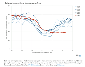 Գրաֆիկը ցույց է տալիս, թե ինչպես են Չինաստանում ամանորյա տոների ժամանակ ածուխի այրման ծավալները միջին հաշվով նվազում 50%-ով, այնուհետև՝ աստիճանաբար վերականգնվում: Այս տարի վերականգնումը ժամանակավորապես դանդաղել է․ «Դա տեղի է ունեցել այն պատճառով, որ ամենամյա արձակուրդները երկարացվել են՝ համաճարակային իրավիճակը հսկողության տակ պահելու համար, և էներգիայի սպառումը մնացել է անկման վիճակում, չնայած այն բանին, որ աշխատանքը պաշտոնապես վերսկսվել է փետրվարի 10-ին», – ասվում է զեկույցում: